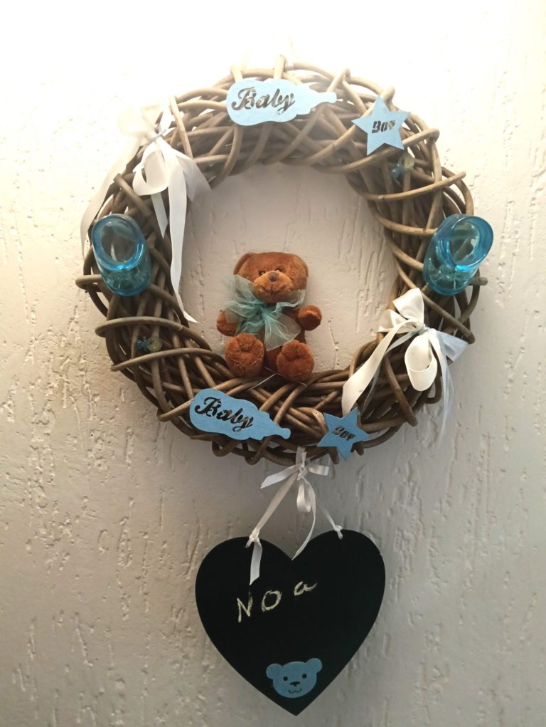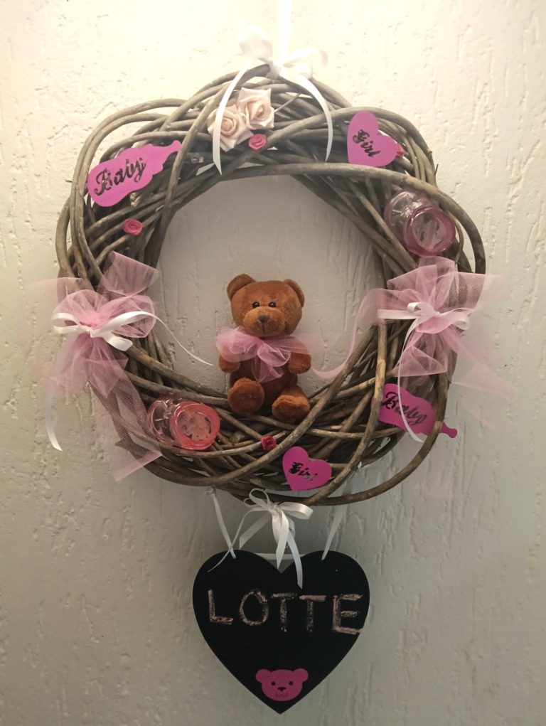 Geboortekrans voor aan de deur. Voor een jongen of een meisje. Aan de onderkant zit een hartje waar je de naam van de kleine op kunt zetten. Huur voor 1 week € 10 . Elke volgende week voor € 7.50.