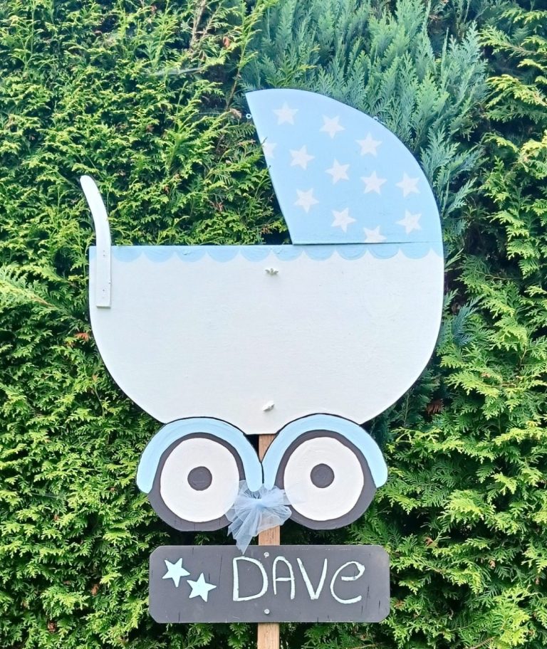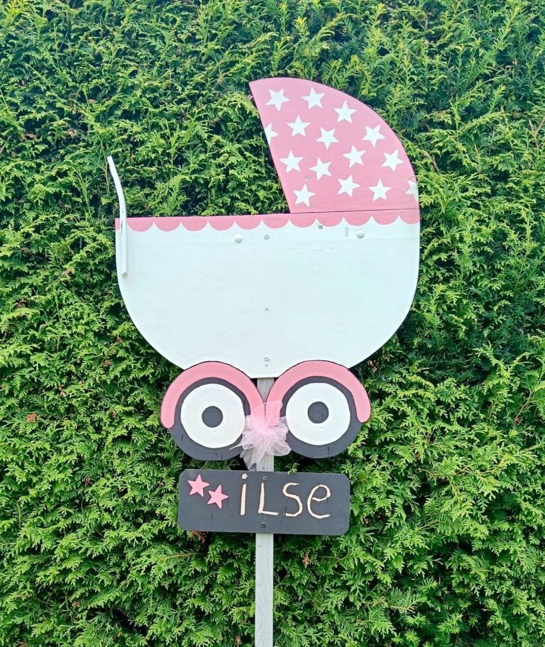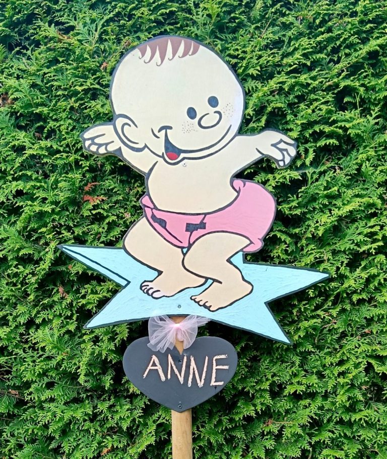 Een grote wegwijzerpaal, geboortepaal, wegwijzer geboorte ( 2.70 hoog) waar u de naam en de geboortedatum van uw kleine zelf kunt invullen.