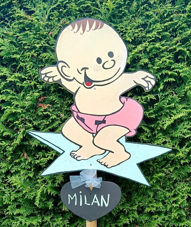 Grappig babybord,met een tekst erbij van pap mam,ik ben er.De baby belt even naar pap en mam dat hij of zij er is..Tevens krijgt u er gratis een naambordje bij te huur.